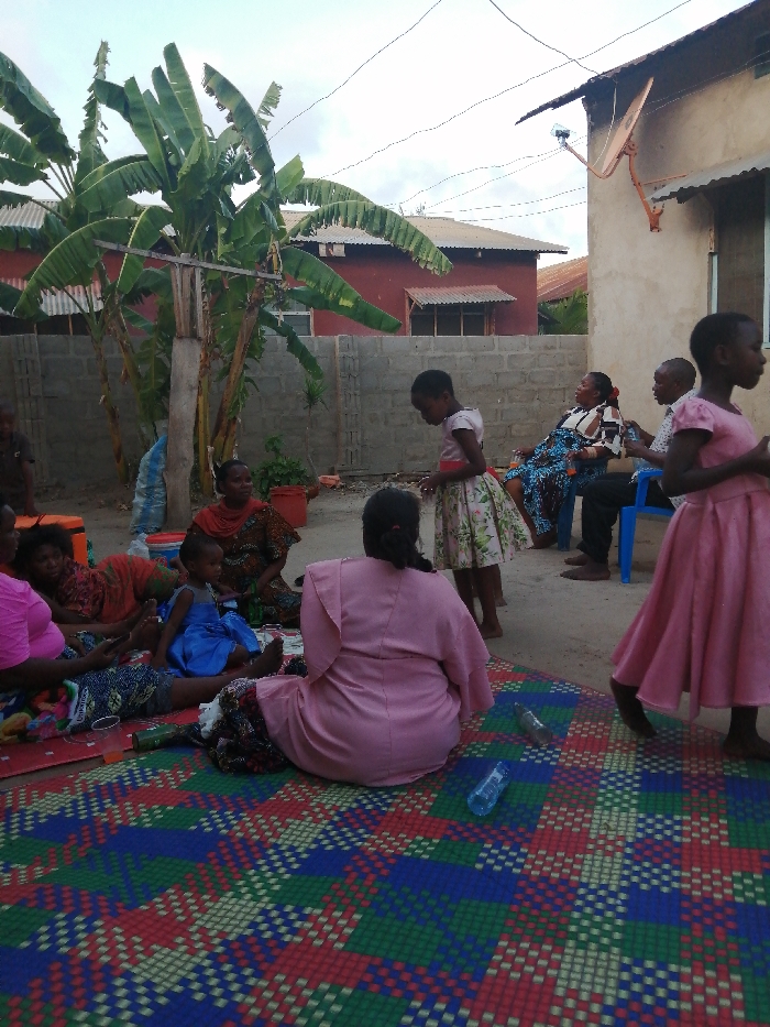 A group of people, mainly women and children, are gathered outside on a checkered mat. Most are seated or lying on the mat, while a few adults sit on a chair in the background. Two young girls in pink dresses stand. A few bottles are visible on the mat. Behind them, a concrete block wall separates the area from a red building with a metal roof. A banana tree stands to the left of the wall. A small building with a satellite dish attached is visible to the right.