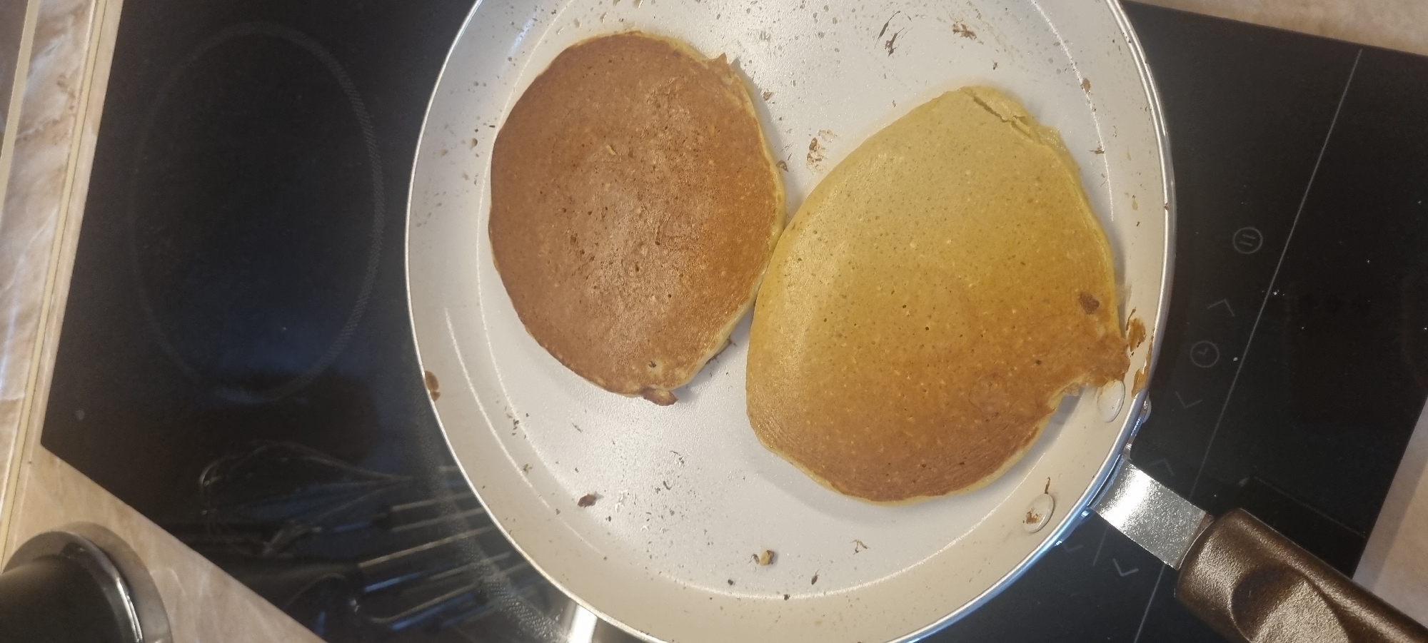 The scene depicts two cooked, pancake-like items resting within a white non-stick frying pan in a kitchen located in Samokov, Bulgaria. The pan, which exhibits scattered dark brown residue on its interior surface, has a brown handle extending towards the bottom left of the frame. One pancake, positioned centrally towards the top, is uniformly golden-brown and largely circular. The second pancake, situated towards the bottom, is an irregular ovoid shape and displays a lighter golden-yellow hue. The frying pan rests on a black, smooth-surface electric cooktop, visible with white outlined burner zones and touch control markings including a clock icon and arrow indicators. In the background, a light-colored, possibly patterned countertop is present, with a partial dark, reflective object visible in the upper left corner. No individuals are depicted.