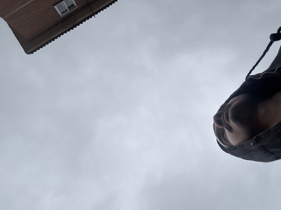 The image, taken from a low angle, depicts an urban setting in Madrid, Spain, under an overcast sky. In the bottom-left quadrant, a male individual is positioned, wearing a dark hooded jacket with the hood raised. He is seen from the chin up, looking directly towards the sky, with his head tilted back, revealing his nose, mouth, and a dark mustache. His eyes are not clearly visible due to the angle. The upper-right quadrant displays a portion of a building constructed from reddish-brown brick, featuring a single visible window with a white frame and a distinct scalloped eave or cornice line along its upper edge. The majority of the background is a uniform, light grey, cloudy sky.