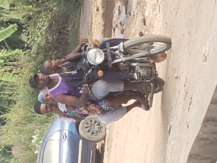 A motorcycle carries four people on a road. The driver wears a purple tank top. The passenger behind him wears a blue head wrap and floral shirt. Another passenger wears a black shirt, and the last passenger's face is visible behind them. A blue car is parked nearby on the left, and vegetation is visible in the background. The road surface is rough, and the image is slightly tilted.