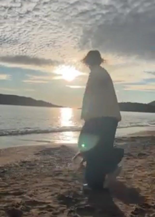person in loose dark pants and a light-colored jacket standing on a sandy beach. The sun is setting over the ocean, creating a bright reflection on the water. The sky is filled with small, puffy clouds. The person walks briefly away from the camera before turning around. A small dog runs in front of the person.