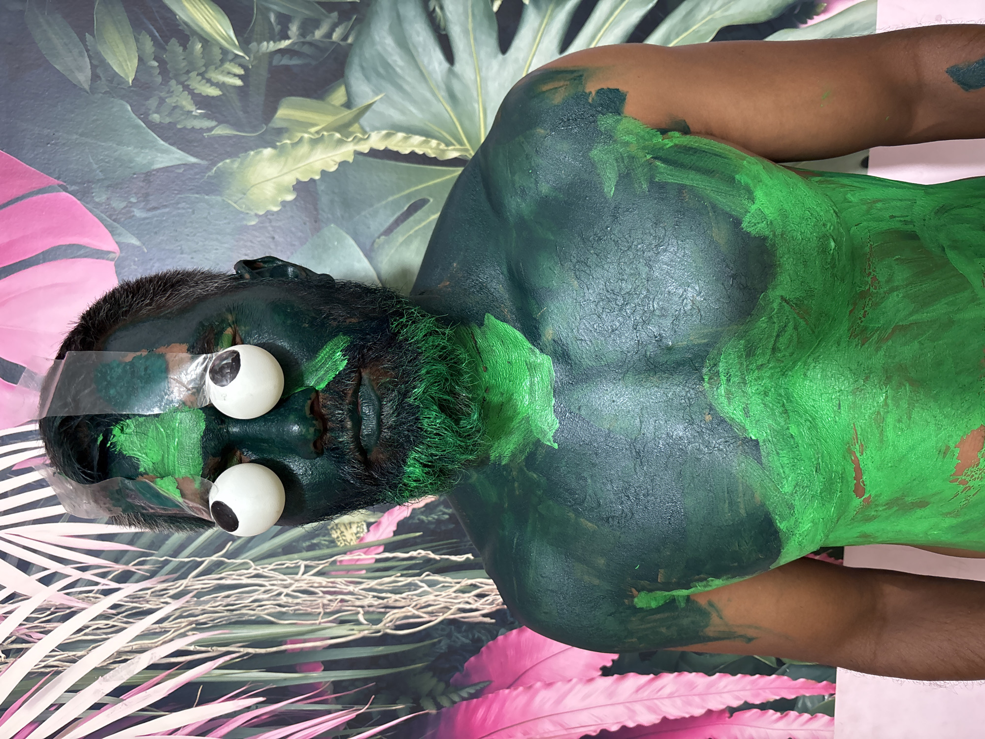 A man lies on his back on a surface decorated with a tropical leaf design, with some of the leaves appearing pink. The man's body and face are painted in shades of green, with areas of dark and light green. He has large, artificial eyeballs attached to his eyelids, and a clear plastic strip is visible above his forehead. The image does not provide any information about the location or city.