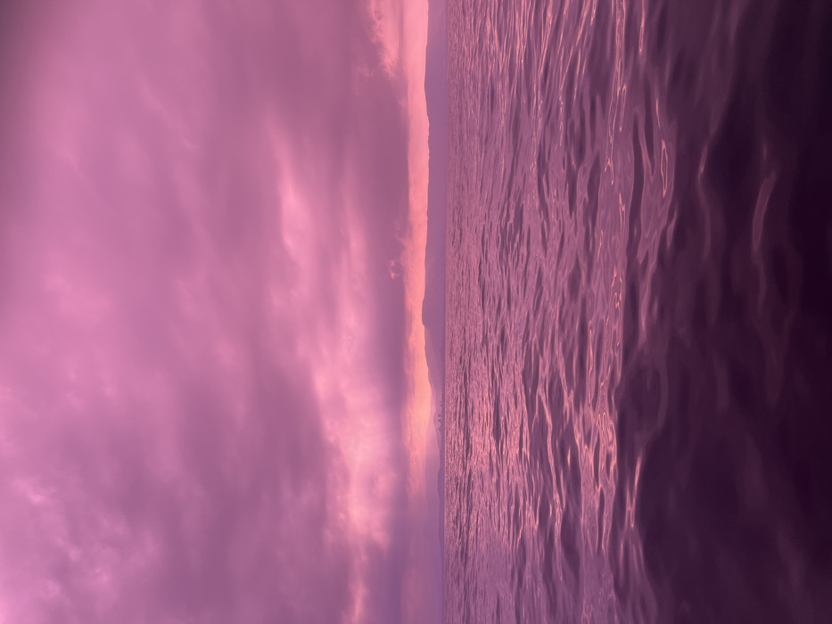 A vivid, rotated view of the ocean at sunset. The water dominates the lower half, its surface rippling and reflecting light in shades of pink and purple. Above, a thin strip of land separates the water from a dramatic sky filled with voluminous clouds, also bathed in the sunset's pink and purple hues. The horizon line is slightly off-center, adding to the dynamic composition. The image evokes a sense of tranquility and the beauty of nature's color palette.