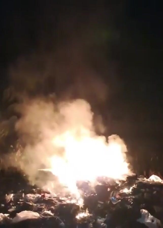 large fire burning amidst what appears to be a pile of trash or debris in a dark outdoor setting. The flames are bright, casting a strong light, and producing a significant amount of smoke that rises into the dark sky. The scene is poorly lit, making it difficult to distinguish the exact contents of the burning pile, though it appears to include plastic or other manufactured materials. In the background, there are hints of vegetation, possibly trees or bushes, adding context to the outdoor environment. There are also a few indistinct voices heard in the background, suggesting the presence of people nearby.