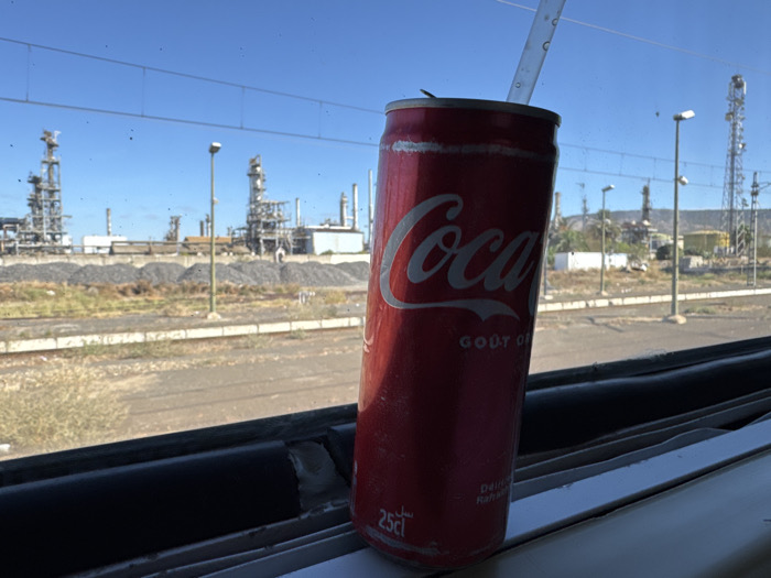 This image captures a close-up of a red 25cl Coca-Cola can with a white plastic straw, positioned on a dark window ledge, likely within a train or vehicle. The can features "Coca-Cola" and "GOUT ORIGINAL" in white lettering and shows surface moisture. Beyond the window, which exhibits minor streaking, a clear blue sky is visible. The scene unfolds in an industrial area of Sidi Kacem, Morocco, specifically near the ONCF railway network, adjacent to what appears to be the former SAMIR oil refinery. Multiple railway tracks run horizontally across the midground. Adjacent to the tracks, an unpaved, dry earthen area is visible, containing sparse, light-colored vegetation and several conical piles of dark, coarse material, possibly gravel or industrial aggregate. A tall, slender grey light pole stands between the tracks and the distant industrial structures. The background is dominated by a large industrial complex, characterized by numerous intricate metal towers, pipes, and storage tanks, indicative of an oil refinery or chemical plant. These structures are grey and metallic. Overhead, thin electrical wires traverse the sky. In the far distance on the right, faint, low-lying hills are discernible. The environment suggests a bright, sunny day. No human figures are present.