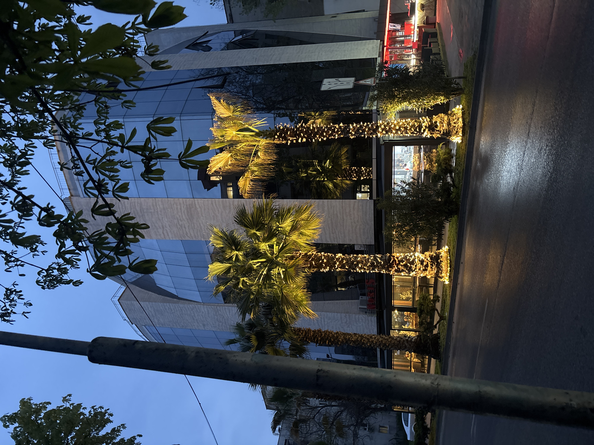 The image depicts a nighttime scene in Plovdiv, Bulgaria. In the background, a modern building with a curved glass facade is visible. Palm trees line the sidewalk in front of the building, with their trunks illuminated by strings of lights. A wet asphalt road runs along the right side of the frame, reflecting the ambient light. The lower part of the image includes a grey metal pole, possibly a lamppost, partially obscuring the view. A building is visible in the background, with a restaurant inside. The scene suggests an urban setting at dusk or night.