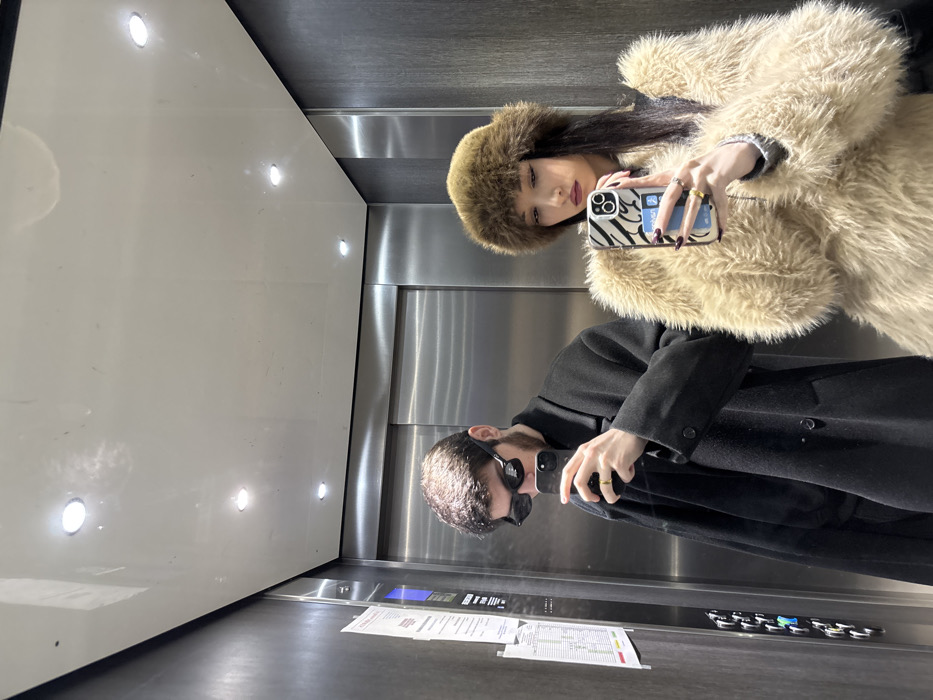 A couple is taking a selfie in an elevator. The woman wears a large, fluffy coat and a fur hat, while the man is dressed in a black coat and sunglasses. They are both holding their phones. The elevator's interior features a white wall with recessed lighting and a stainless steel wall with the elevator controls. There are some papers on the elevator floor.