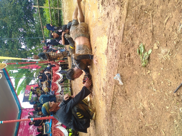 The image depicts an outdoor event taking place in the city of Kerjo, Indonesia. The scene is set on uneven, predominantly brown earth, with a significant area of dark brown mud and standing water visible in the foreground and midground. In the immediate foreground, to the bottom right, a crumpled clear plastic bottle and several discarded green leaves are present on dry, cracked earth. A thin, dark, stick-like object or cable lies at the very bottom edge of the frame. The central action involves three male individuals. To the left, a man with a dark head covering and dark long-sleeved attire, exhibiting yellow markings on his shins, kneels on his left knee. He is leaning forward with both hands extended towards the head of a second man lying prone in a muddy puddle directly in front of him. This second man is mostly obscured, but his head is near the kneeling man's hands, and his upper body is submerged in the mud. To the right of the first prone man, a third male lies fully prone on his stomach in the mud, facing left. He wears a dark, possibly short-sleeved top and light-colored shorts or pants, all heavily soiled with mud. His bare lower back and legs are visible, extended towards the right. A fourth male, appearing younger and wearing a black baseball cap and a black t-shirt with a white "50" graphic, is squatting near the third prone male, observing the scene. In the midground, under a temporary canopy structure, a group of individuals is gathered. The canopy is white with red fabric borders and decorative elements. Underneath, an elevated platform or table is draped with white fabric featuring red decorative borders. On this table, several traditional musical instruments, including large golden gongs and a drum, are visible. Various people are seated and standing behind the table, observing the activities in the mud. Notable among them is a man standing erect, dressed in a dark top and a patterned lower garment, positioned to the right of the table, facing the prone individuals. Behind the group, a large banner with text and a circular emblem is partially visible. The background consists of dense green foliage and trees, indicating a natural or semi-rural environment. A crude bamboo fence is visible running horizontally across the mid-to-background, with several individuals standing behind it, also observing the event. The ground transitions from dry earth in the foreground to a muddy, wet area where the main subjects are situated, and then back to drier ground under the canopy.