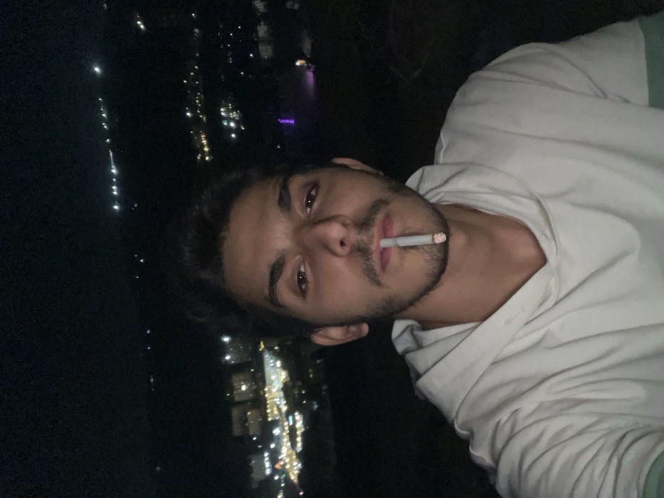 A nighttime image depicts a young adult male with dark hair and a short beard, wearing a white hooded sweatshirt over a light green or teal garment. He is positioned centrally, looking directly at the viewer, with a lit cigarette held between his lips, its ember glowing. The background is an out-of-focus panorama of numerous scattered artificial city lights, indicating an elevated viewpoint over an urban area. This scene is located in Dummar Municipality, Syria.