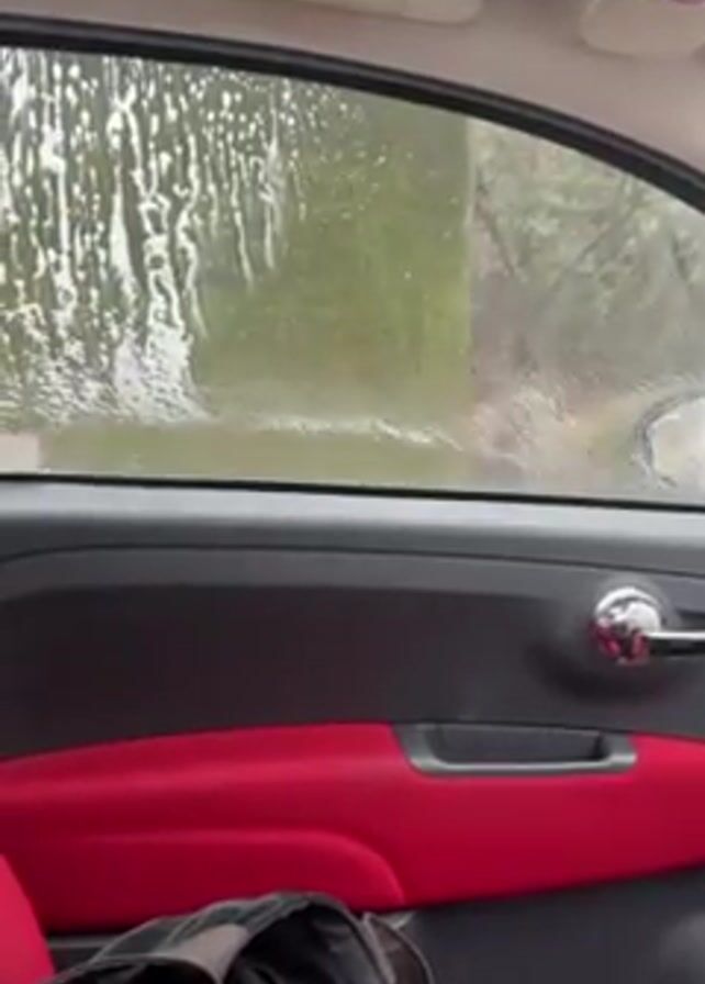 The interior of a car, specifically the driver's side, is visible. The car has red leather seats, a gray door panel, and a silver door handle. A black bag is on the seat. The driver's side window shows a view of a car wash in action. A stream of water and foam is spraying the car's exterior, obscuring the view beyond the window. The car also has a sunroof.