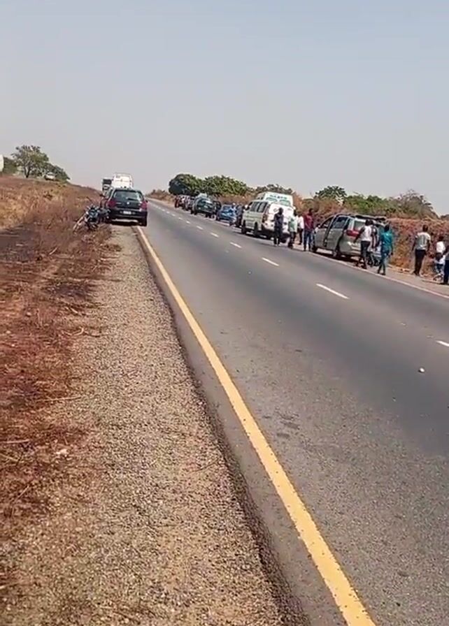 rural road with several vehicles parked along the shoulder, facing the same direction. A group of people stands near the roadside, some on an embankment overlooking the road. The ground around them is littered with white paper. The overall scene suggests the aftermath of an event, possibly an accident or incident, that has drawn a crowd.