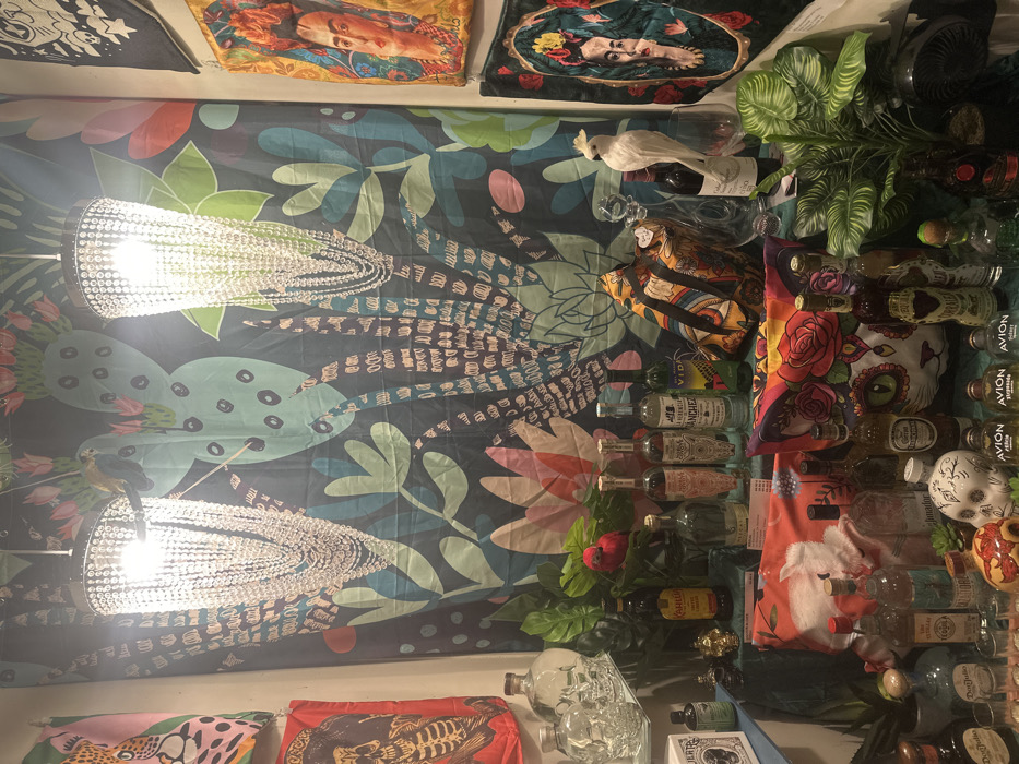 This image depicts an interior retail display area in Strasbourg, France, themed with Mexican cultural motifs. A large textile tapestry featuring stylized cacti and agave plants in shades of teal, green, and coral serves as the primary backdrop. Two ornate crystal chandeliers illuminate the scene from above. Various objects are arranged on multiple shelves, forming a dense product display. On the left wall, two additional textile hangings are visible: one with a leopard print and another depicting a skeletal figure on a red background. On the right wall, two textile portraits of artist Frida Kahlo are displayed. The shelves are crowded with numerous bottles of spirits, predominantly tequila and mezcal, with identifiable brands including Maestro Dobel, Casa Sanchez, Montelobos Mezcal, Vida Mezcal, Corralejo Tequila, Don Julio, Kahlua, and Avion Tequila. Some bottles are clear glass, while others contain amber or darker liquids. Several bottles are shaped like skulls. Decorative elements are interspersed throughout the display: * Faux tropical foliage, including large green leaves, is arranged on and around the shelves. * Two decorative birds are present: a red parrot perched on a shelf and a white cockatoo beside a bottle of red wine. * A gold skull figurine and a white decorative skull with black markings are visible on the lower shelves. * Several cushions or pillows with vibrant patterns are placed among the bottles, one featuring a "sugar skull" cat design and another a white cat. * A clear glass decanter with a stopper and a wine glass containing red liquid are positioned on the right side. * Small white price tags are visible beneath some items. * A small black fan is partially visible on the bottom right. The overall environment suggests a vibrant, curated collection for sale.