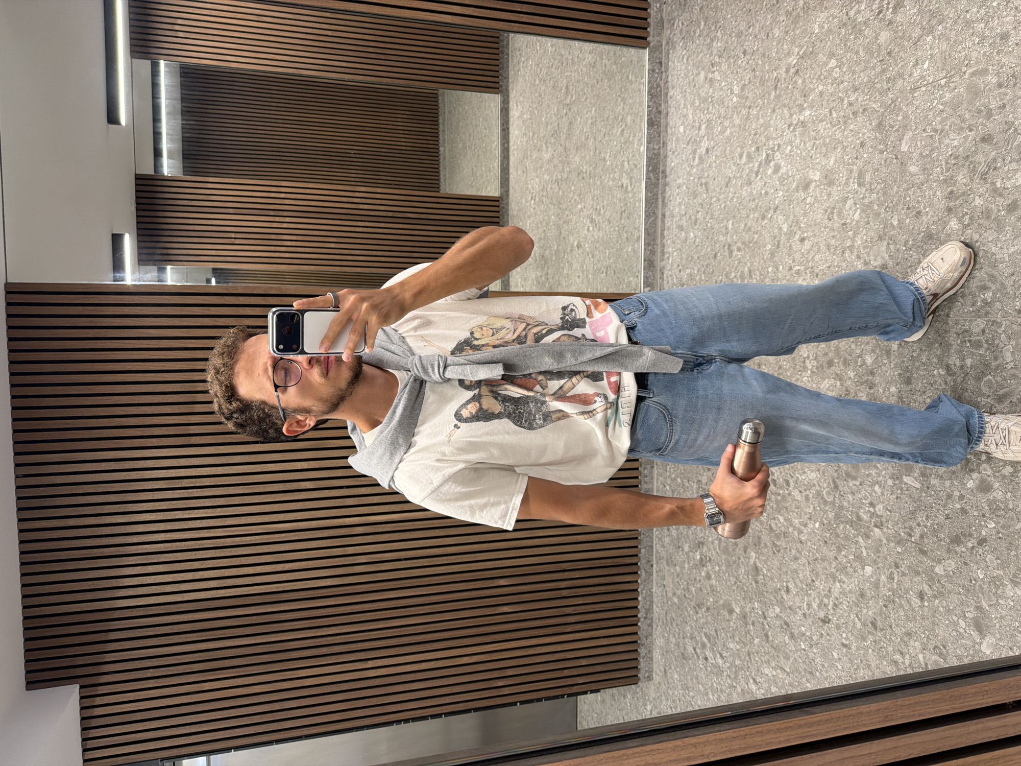 A man is standing in a room taking a selfie in a mirror. He is wearing glasses, a white t-shirt with a graphic print, light blue jeans, and white sneakers. A grey hoodie is tied around his shoulders. He is holding a silver water bottle in his left hand and a smartphone in his right hand to capture the photo. The room has a wooden slat wall on one side and a grey tiled floor. The mirror reflects the room's interior, including a partial view of another section of the wooden slat wall. There is no evidence to suggest the image was taken in Livadia Larnakas, Cyprus.