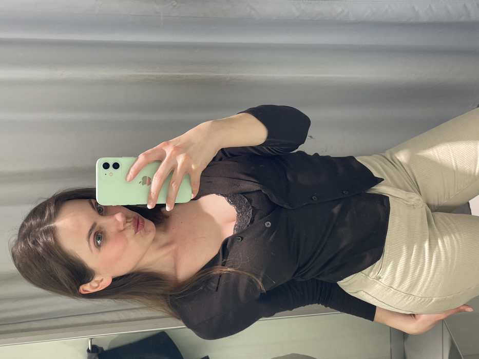 A young woman is depicted taking a mirror selfie in an indoor setting, identified as a changing room in the city of Pompei, Italy. She has long, dark brown hair, with her head slightly tilted and lips pursed in a pout. She looks directly towards the camera of a light green iPhone, held in her right hand to capture her reflection. The phone case features a visible Apple logo. She is dressed in a dark brown, long-sleeved cardigan, partially unbuttoned to reveal a black lace-trimmed top underneath, paired with light beige corduroy pants. Her left hand is positioned near her hip. The background consists of a light gray fabric curtain on the right side and a dark, indistinct fixture on the left.