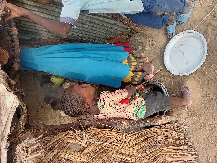 Inside a makeshift shelter constructed from corrugated metal and thatch, two children lie on the ground. A child in a patterned shirt and gray pants rests near a metal bowl, while another child is covered by a blue cloth. The feet of two adults are visible nearby, one wearing blue sandals. A white plate sits on the ground outside the shelter. The scene appears to depict a family seeking refuge in a rudimentary dwelling.