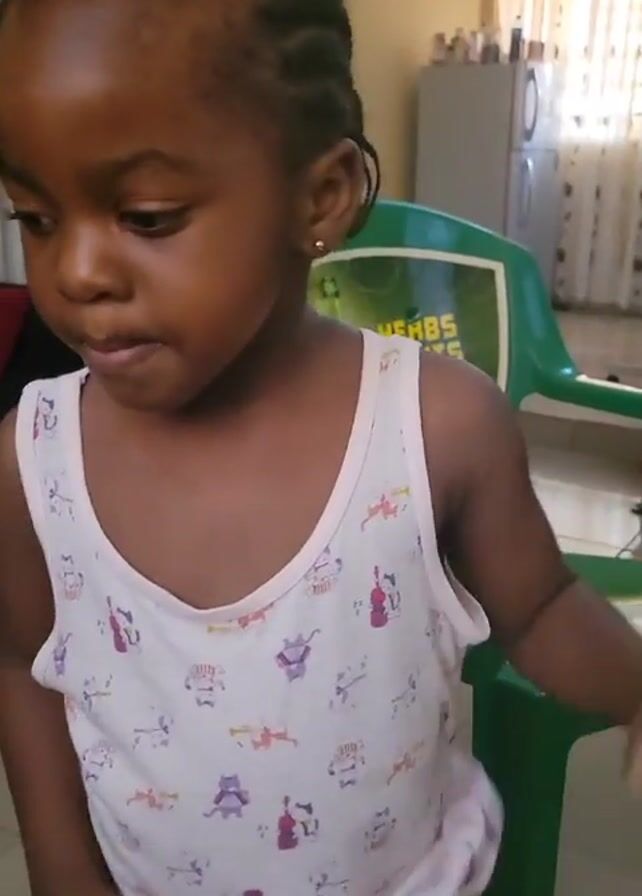 A young Black girl with cornrow braids and small gold earrings, wearing a white tank top patterned with musical instruments, stands indoors. She is facing the camera and slightly looking down, her mouth slightly open. She scratches behind her ear. A green plastic chair is behind her, and in the background is a refrigerator, curtains, and other furniture. The lighting is fairly bright.