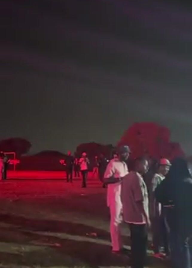 At night, a group of people gather in a field under red and purple lighting. The field appears to be grassy with some trees and a gate structure visible in the background. People are walking and standing around, some appear to be in groups talking. The overall scene has the feeling of an outdoor event or party.