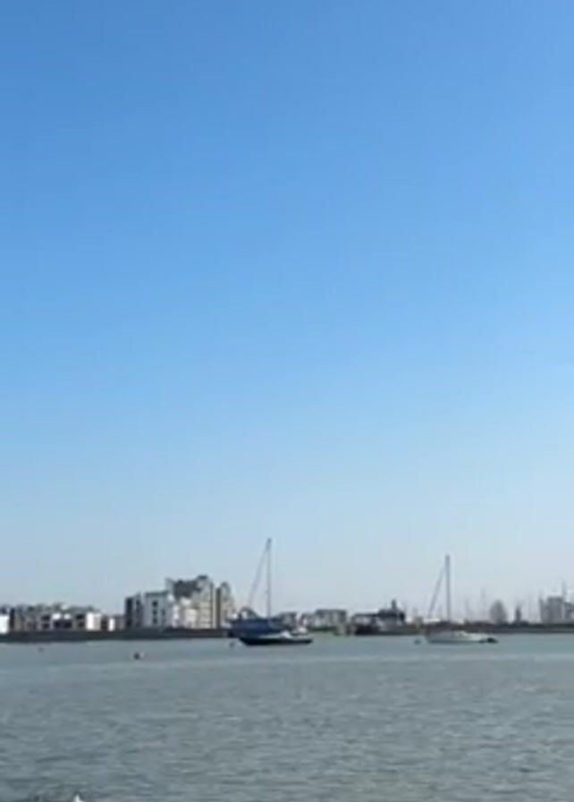 The video presents a wide shot of a calm harbor on a clear day, with a cloudless blue sky overhead