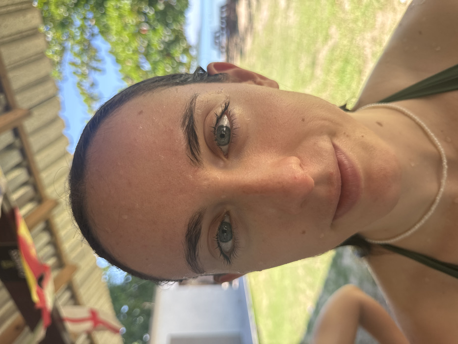 A female subject is centered in a close-up, head-on portrait, with fair skin, dark eyebrows, and light blue-green eyes. Her dark hair is pulled back and appears wet, along with visible water droplets on her face and shoulders. She wears a dark green swimsuit top and a thin white beaded necklace, displaying a neutral to slightly smiling expression. The scene is set in Rio Bueno, Jamaica. In the upper background, under a wooden beam roof, a red, yellow, and black banner (partially identifying as Guinness) and a white flag with a red cross are visible. The background, out of focus, features a white building to the left, green foliage and trees to the right, and a body of water with boats in the far distance, beneath a clear blue sky. Green grass occupies the mid-ground. The blurred arm of another individual is partially visible in the lower-left.