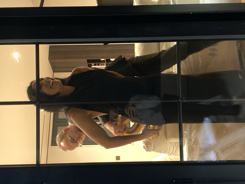 A woman in a black dress is seen laughing through a glass window. Below her, a man with glasses holds a gold balloon shaped like the letter "O." The room beyond the window features a neutral color palette with a gray cabinet and white furniture. The scene is framed by a black windowpane grid. The perspective suggests the image was taken from outside looking into a brightly lit interior.