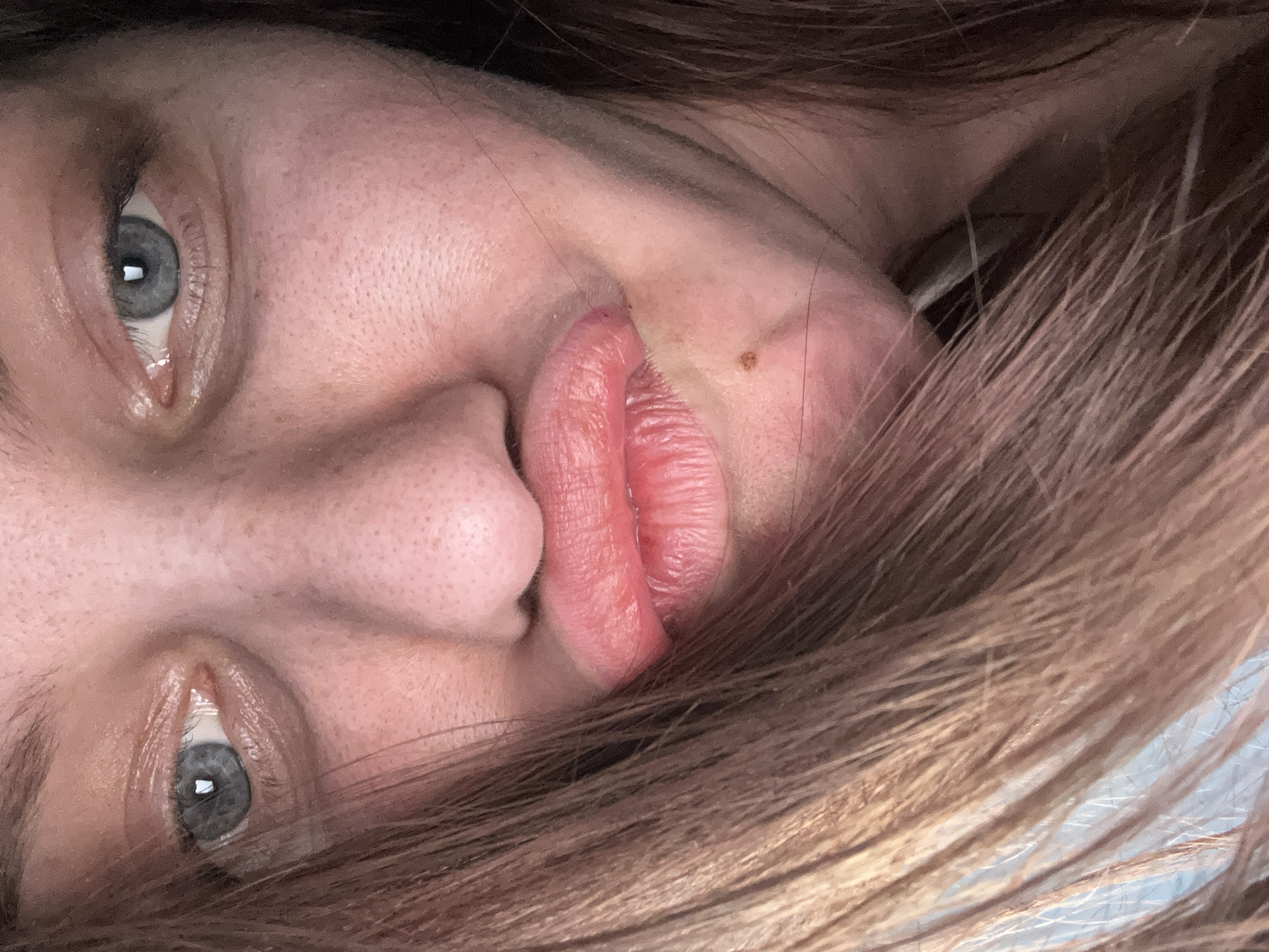 A close-up, inverted image shows a person's face. The face is pale with gray eyes. The person has brown hair framing the face. The lips are pink and appear slightly parted. A mole is visible near the upper lip. The background is out of focus and partially obscured by hair, but what is visible appears to be a light, possibly blue, surface. The location is not identifiable as Varna, Bulgaria.