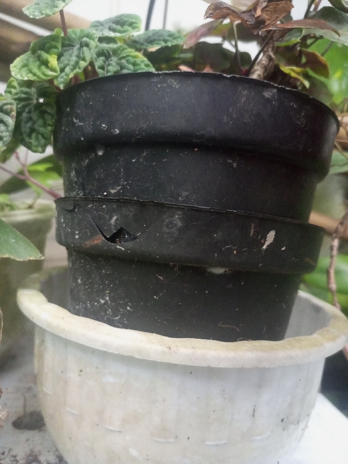 An upward-angled close-up shot captures three weathered plant pots stacked vertically in Zee Pin Kone, Myanmar. The topmost pot is black plastic, containing a plant with textured, ruffled green leaves and some dried, reddish-brown foliage visible on the right. This black pot is seated within a second, smaller black plastic pot directly below it. The second black pot displays significant wear, including a distinct, jagged crack or hole on its upper left side. Both black pots exhibit dirt and mineral residue. The bottommost pot is a wider, off-white ceramic or heavy plastic container with a ribbed exterior pattern, serving as the base for the stack. The background is out of focus, revealing hints of additional green plant life and a light-colored structure. No individuals, actions, or interactions are present in the frame.