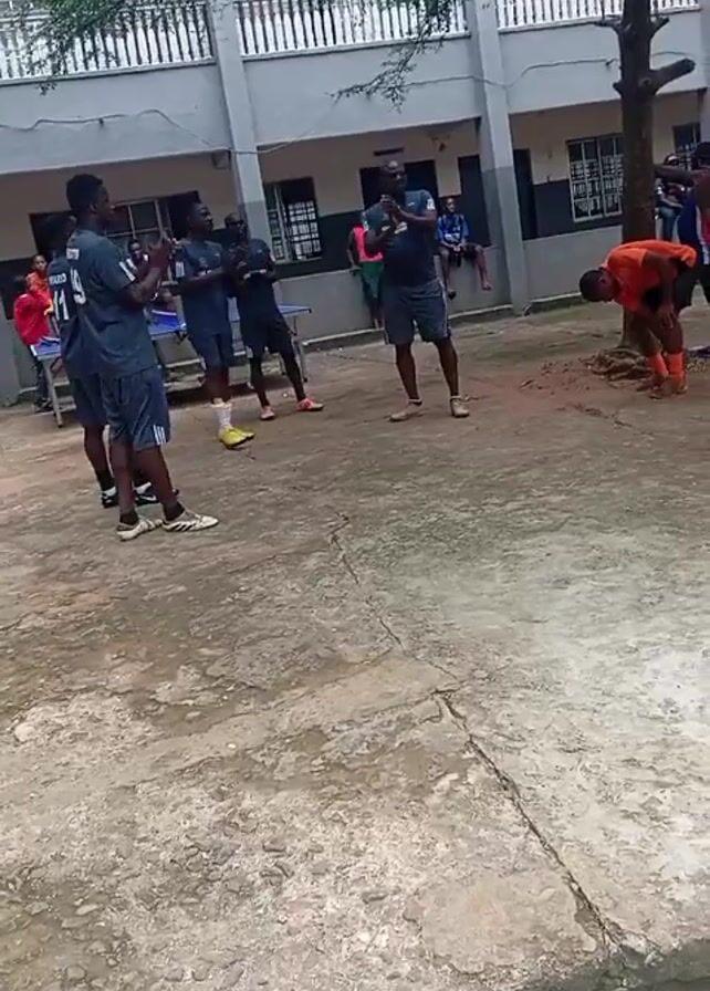 group of people, mainly young men in athletic wear, gathered in a courtyard of a building. They appear to be a sports team or a group of athletes, possibly after a practice or game. One man, who seems to be their coach or leader, is standing and talking to the group while gesturing with his hands. Several people are watching and listening, some are clapping. Another person in an orange shirt is bent over, possibly stretching or attending to something on the ground. The courtyard is paved, with a tree to the right and a two-story building in the background. The building has a balcony on the upper level. The overall impression is that of a team meeting or debriefing in an outdoor setting.
