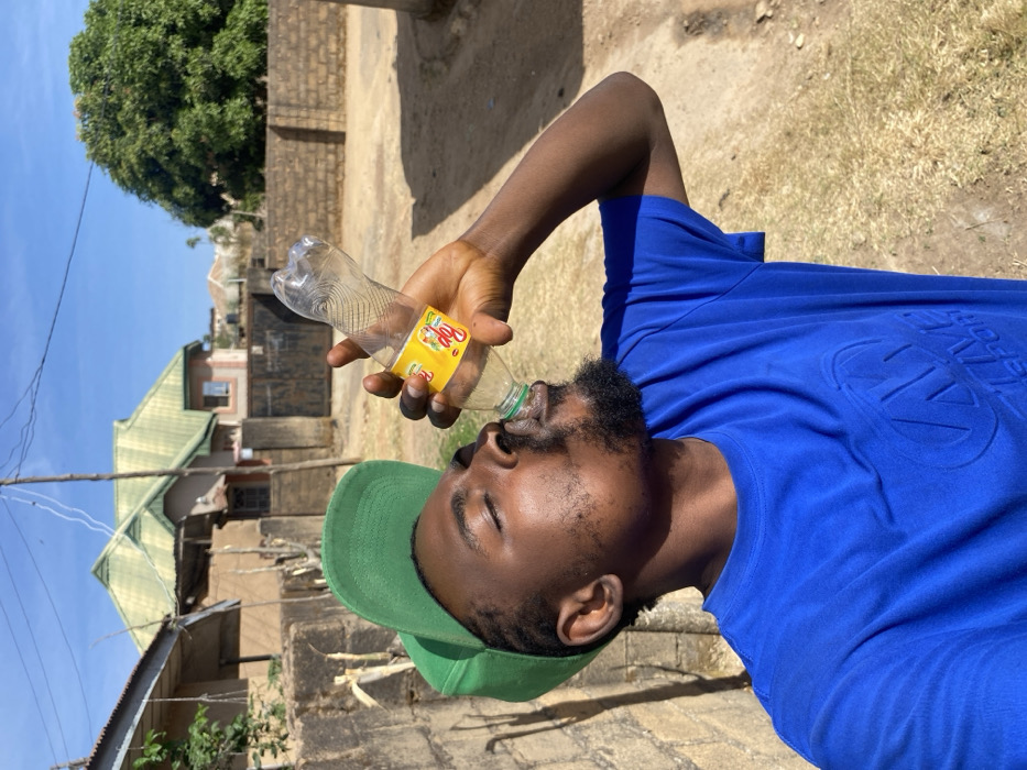 The image depicts an outdoor scene in Barakin Akawo, Nigeria, under a clear blue sky with bright sunlight casting sharp shadows. A male individual, appearing to be in his late 20s to early 40s, with dark skin, a beard, and a mustache, is shown from the chest up, positioned slightly below and to the left of the frame's center. He wears a bright green baseball cap and a royal blue short-sleeved t-shirt with a raised "AVE SPORTS" logo. His eyes are closed, and his head is tilted back as he drinks from a clear, partially crumpled plastic bottle, held in his right hand. The bottle features a yellow label with "Pop" printed on it and contains a small residual amount of clear liquid. The background reveals a residential area with dry, light brown soil or dirt as the ground cover. Prominent structures include a house with a green corrugated metal roof and light-colored walls, partially obscured by a concrete block wall or fence. To the right, a dark metal double gate of a compound entrance is visible. Further right, a substantial tree with dense green foliage stands against the sky, behind another concrete block wall. A wooden utility pole with overhead wires is visible against the clear sky in the mid-background. Another building with a grey roof and light-colored walls is partially visible on the far left.