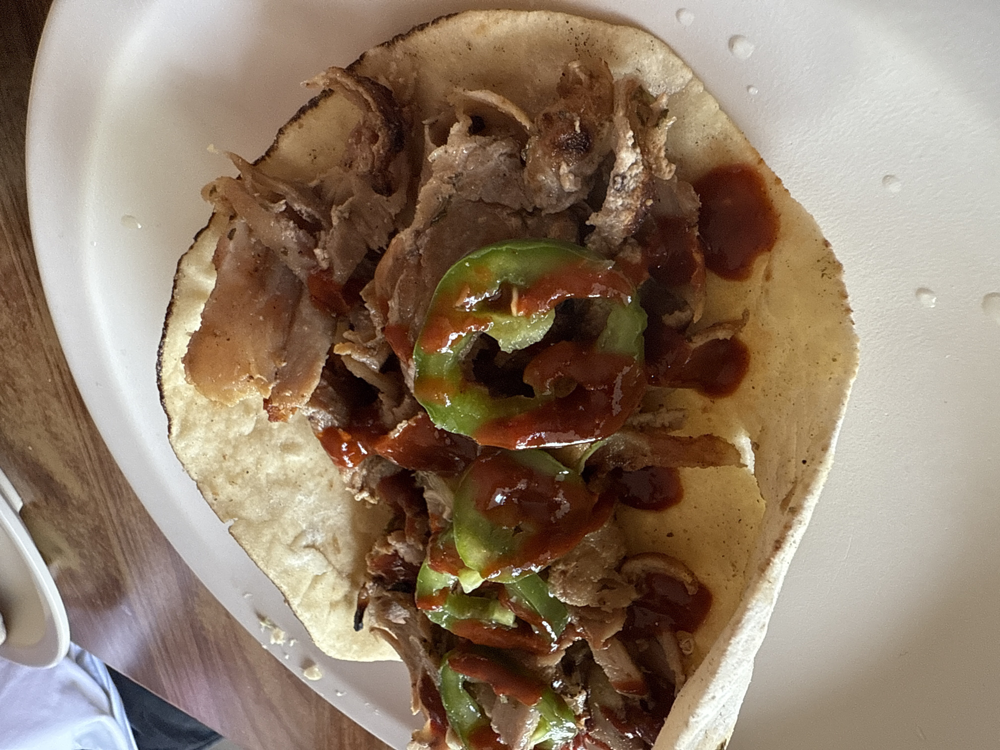 A large, open-faced food item resembling a taco or quesadilla rests on a white, round plate. The food consists of a single, thick corn tortilla, lightly browned and slightly charred at the edges, serving as the base. It is topped with a substantial amount of shredded or pulled light-brown meat, some pieces exhibiting darker, crispier textures. Several circular slices of green pepper are interspersed among the meat, all covered by a thick, dark red sauce that is drizzled generously and has pooled in various spots. The white plate shows multiple small, clear liquid droplets, particularly visible in the lower right section. The plate is positioned on a light-brown wooden table with a visible grain pattern. In the upper left background, a portion of a person wearing a white short-sleeved shirt is visible, alongside a segment of another small, light-colored dish or bowl. The scene depicts a meal in a casual dining setting located in the city of Puebla, Mexico.