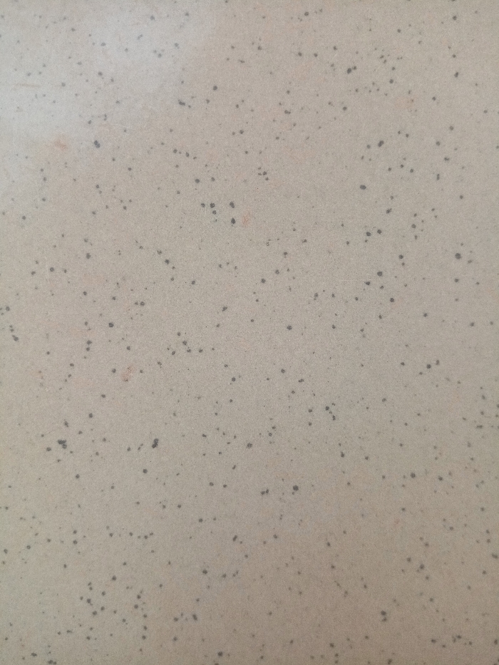 The image, captured in the city of Rido, Nigeria, presents a close-up view of a uniformly illuminated, light beige or off-white surface. This surface is extensively covered with a high density of small, irregularly shaped specks, primarily dark grey to black in color. Scattered among these dark specks are occasional smaller specks exhibiting a reddish-brown coloration. The texture of the surface appears subtly granular or matte. No identifiable individuals, specific objects beyond the specks, actions, or broader environmental features are discernible within the frame.