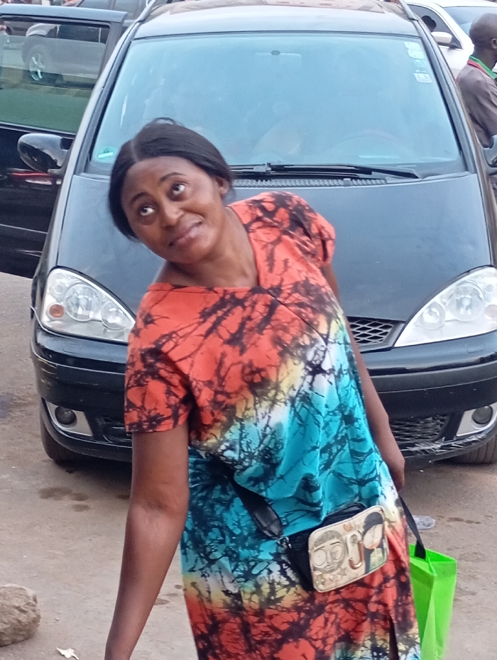 A woman wearing a tie-dye dress, orange and blue, stands near a black car. She wears a small black bag with a cartoon design around her waist and holds a green shopping bag. She looks up with a slight smile. A portion of another car is visible on the left and a man in a brown jacket is partially visible on the right. The setting appears to be outdoors on a city street.