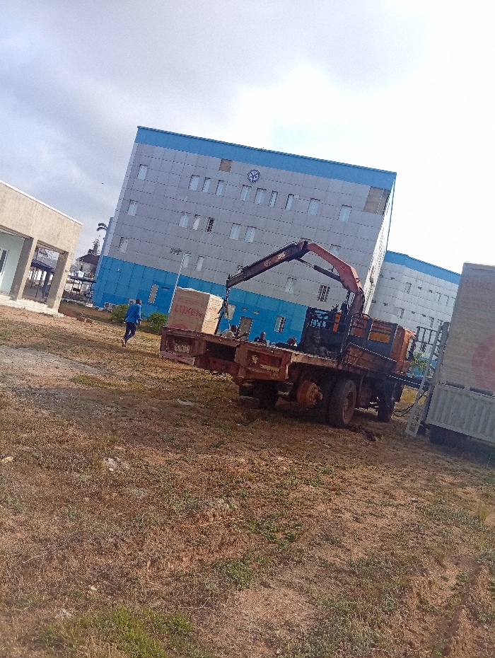 The scene depicts an outdoor area at the Confluence University of Science and Technology (CUSTECH) campus in Okene, Kogi State, Nigeria. In the background, a prominent multi-story building with a facade composed of blue and light gray panels features rows of rectangular windows. A circular blue and white emblem, consistent with the CUSTECH logo, is centered on the upper portion of this building. The sky is overcast. In the mid-ground, an aged, dark-colored flatbed truck equipped with a reddish hydraulic crane arm is positioned on dry, uneven ground covered with sparse brown grass and exposed dirt patches. Stacks of light-colored, rectangular building materials, visibly labeled "LUXEN," are present on the truck's bed. Multiple individuals are gathered around and on the flatbed truck. One person, wearing a blue shirt and dark trousers, walks from left to right across the mid-ground, approaching the truck. A partial view of a white truck or trailer, also carrying labeled materials, is visible on the far right. To the far left, a smaller, light-colored single-story building with a dark roofline stands, indicating ongoing development or recent construction.