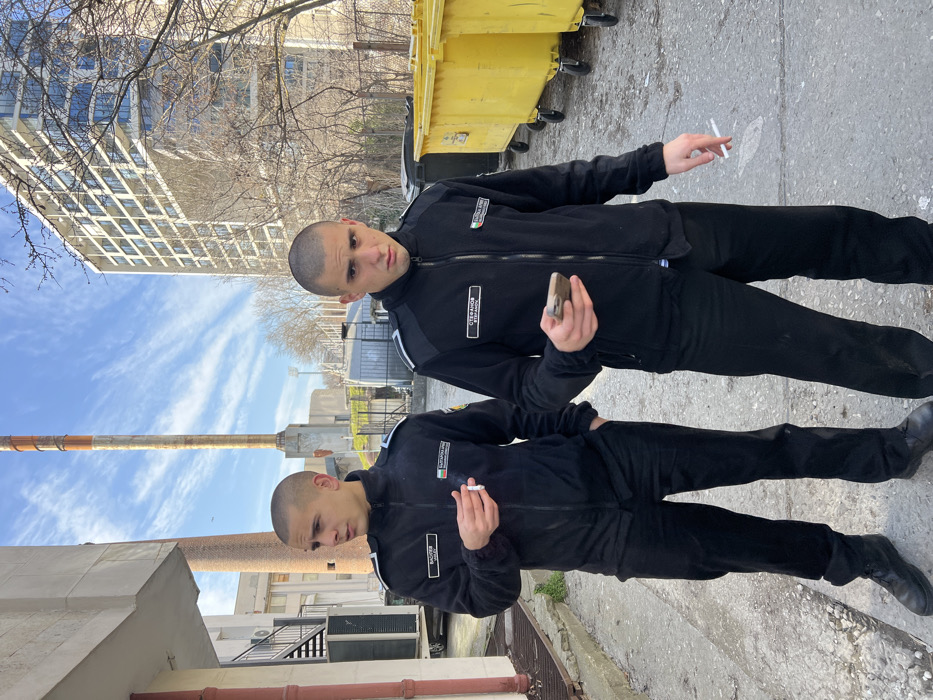 Two young adult males are depicted standing outdoors on a concrete surface under a clear blue sky with cirrus clouds. Both subjects wear identical black long-sleeved zippered uniforms with black trousers and dark boots. Their uniforms feature shoulder epaulets and name tags, with "ВАСИЛЕВ ВАСИЛ" visible on the left subject's tag and "СТЕФАНОВ СТЕФАНОВ" on the right subject's tag. Both uniforms also bear a patch with the Bulgarian flag and the text "БЪЛГАРСКА АРМИЯ" (Bulgarian Army). Both individuals have short, buzzed haircuts. The subject on the left holds a lit cigarette in his right hand, with his left hand in his pocket, and is looking towards his left. The subject on the right holds a light-colored smartphone in his left hand and a lit cigarette in his right hand, looking directly at the camera with a neutral expression. In the background, a prominent tall, reddish-brown industrial chimney, characteristic of the Varna Thermal Power Plant, is visible on the left. Adjacent to this, further back, are various industrial structures and fencing. To the right, behind the subjects, a row of three large, yellow wheeled refuse bins is present. Further in the background, to the far right, a tall, multi-story modern building with numerous windows stands. Bare deciduous trees are also visible in the mid-ground. The scene is located in the vicinity of the Varna Thermal Power Plant in Varna, Bulgaria.