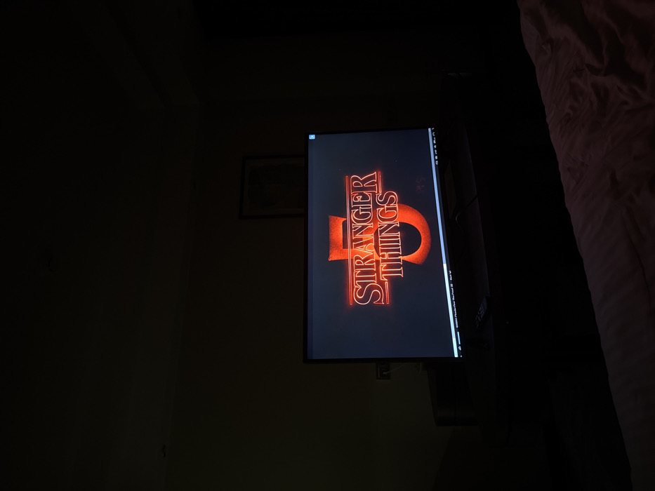 A dimly lit room features a large monitor displaying the "Stranger Things 2" logo. The screen's glow contrasts with the dark surroundings. To the left of the monitor, a framed picture hangs on the wall. To the right of the monitor, part of a white bed sheet is visible. The overall ambiance is dark and quiet.