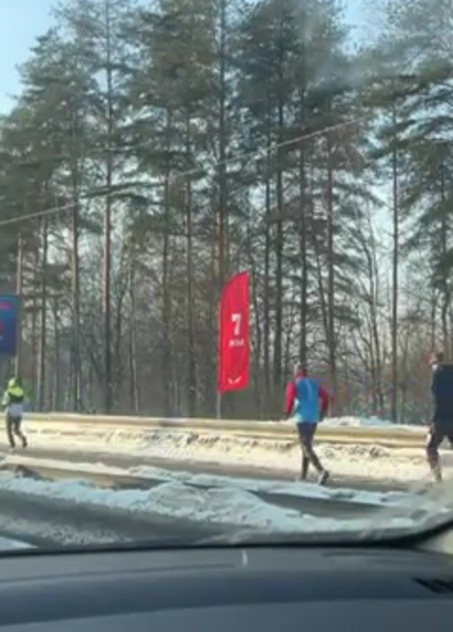 The video is shot from inside a car, looking out at a scene with three people participating in a race or run. The camera is static, capturing the view through the car's windshield. The environment appears to be somewhat rural, with a line of tall evergreen trees in the background. There is a red flag with "7 KM" printed on it, indicating a distance marker for the event. The ground is partially covered with snow. The three people are crossing the road, one running and the other two walking.