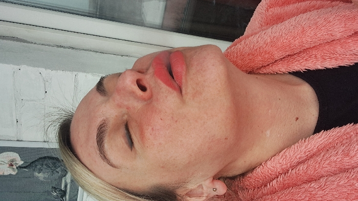 The image captures a close-up portrait of an adult female in Меткомелино, Russia, angled with her head tilted slightly upwards and to the viewer's right. Her eyes are closed, and her lips are pursed in a 'kissing' or 'pouting' expression, coated with a prominent coral-pink lipstick. She has blonde hair, dark, defined eyebrows, and black winged eyeliner visible on her upper eyelids. Her skin displays a fair complexion with scattered freckles and some areas of redness, particularly on the cheeks and forehead. A small, silver stud earring is visible in her left ear. She is dressed in a soft, textured, coral-pink fuzzy garment, likely a robe or blanket, layered over a black garment visible at her neckline. The background features a section of a white brick wall, and to the left, a framed print of a still life with a white orchid in a dark vase. To the right, a portion of a white window frame is visible, with a blurred, indistinct outdoor scene beyond the glass.