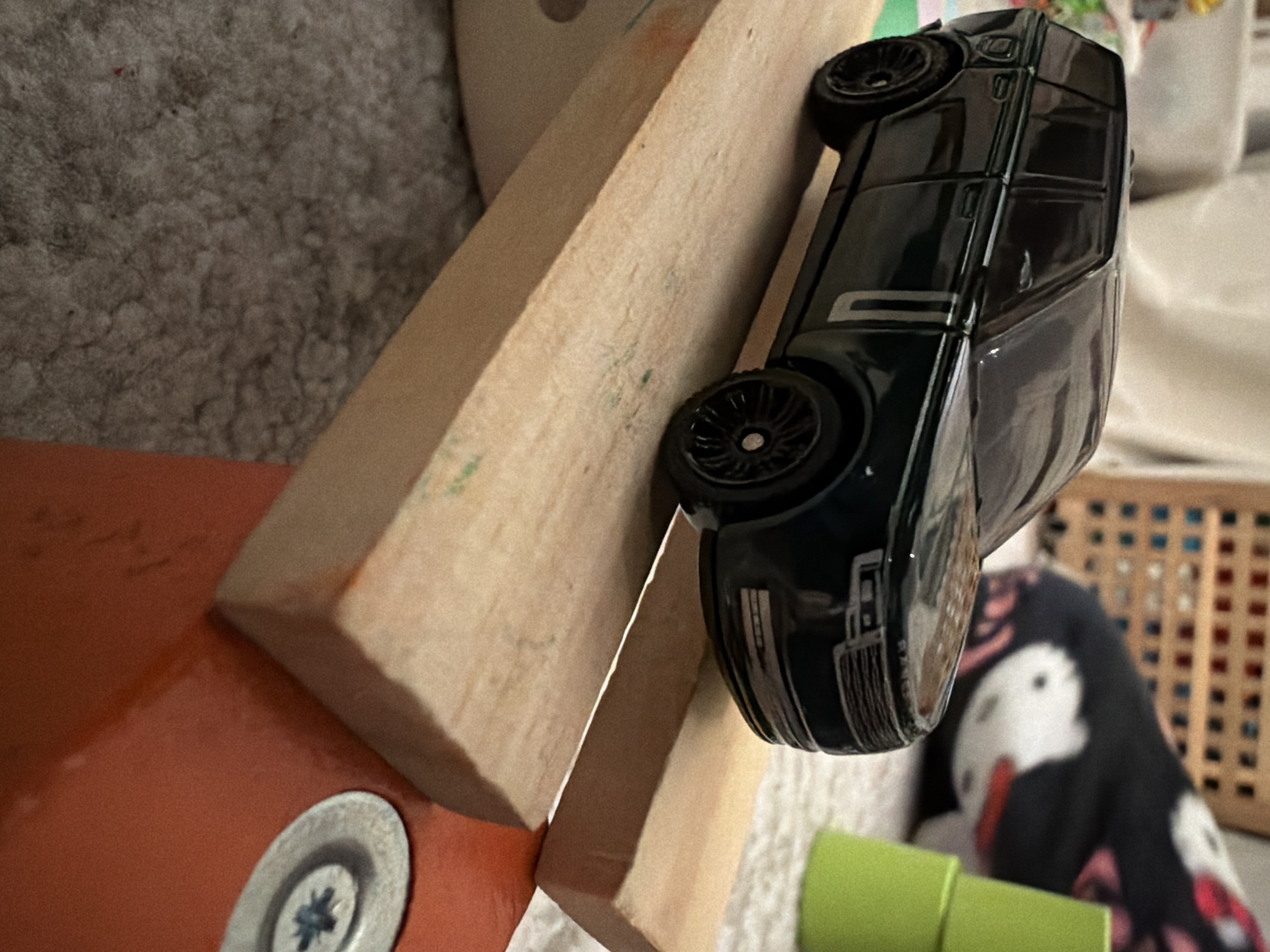 A dark green toy car rests partially on a light-colored wooden surface, angled upwards. An orange surface with a silver screw head is visible beneath the wooden surface. In the background, a white and grey textile with a patterned penguin design is visible. Further in the background, part of a wooden basket can be seen. The scene does not provide information to indicate the location is Pétange, Luxembourg.