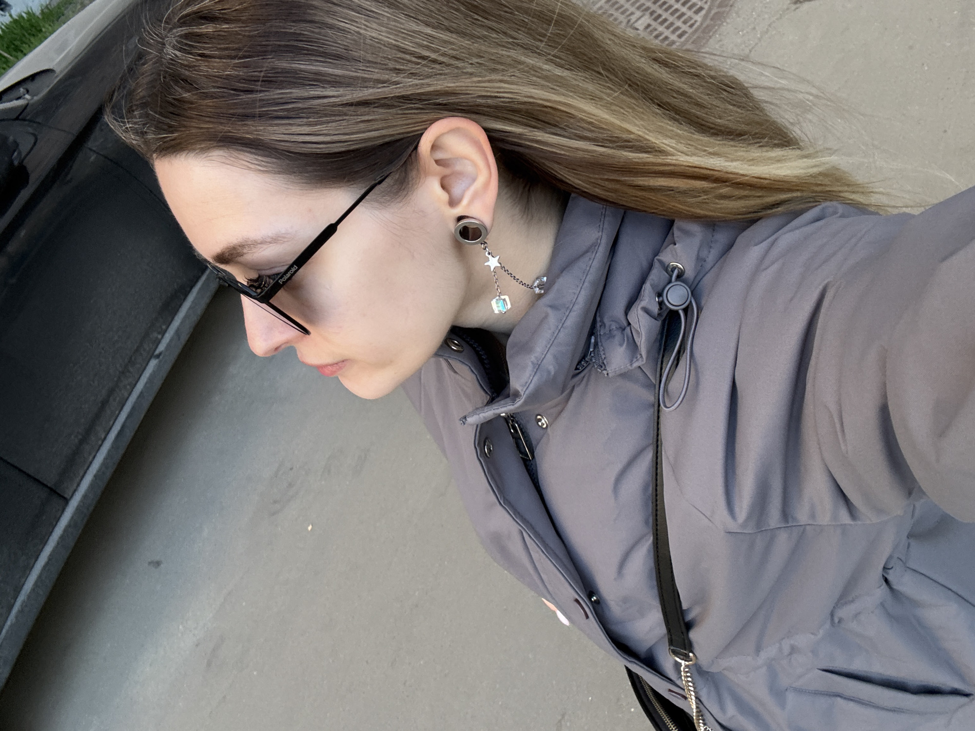 A woman with glasses and dark hair is seen in an upward-angled outdoor shot. She wears a gray puffer jacket. Her left ear has a stretched lobe with a silver-tone tunnel plug earring with a star and crystal charm attached. The glasses have black frames and are labeled "Polaroid." A black car is partially visible on the left edge of the frame, and a gray surface is below. The location is Reutov, Russia.