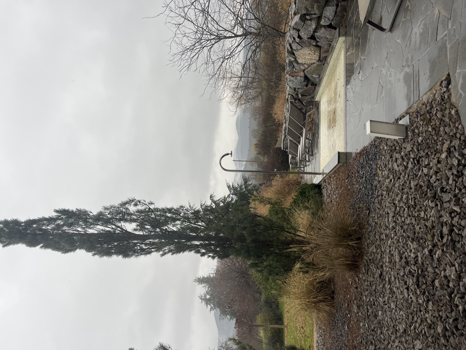 The scene depicts an outdoor leisure area situated in Ribeauvillé, France, under an overcast grey sky. The foreground on the left features a ground cover of coarse grey and brown gravel. A tall, slender conifer tree dominates the left midground, flanked by lower evergreen shrubs and several clumps of dry, golden-brown ornamental grasses. To the right, a wet, irregular grey flagstone patio extends. A short, silver-colored columnar light fixture is positioned on the edge of this patio. Further back, a curved, stainless steel outdoor shower stands over a small, rectangular tiled basin, which contains standing water. Adjacent to this, a row of five unoccupied grey mesh lounge chairs is arranged. A low, dry-stacked stone wall constructed from large, irregular grey and brown rocks forms a boundary along the right side. The background reveals a natural landscape consisting of bare deciduous trees and evergreens, with distant hills or mountains visible beneath the cloudy sky, exhibiting patches of snow at higher elevations. No individuals or animals are present. Wet surfaces throughout the scene indicate recent precipitation.
