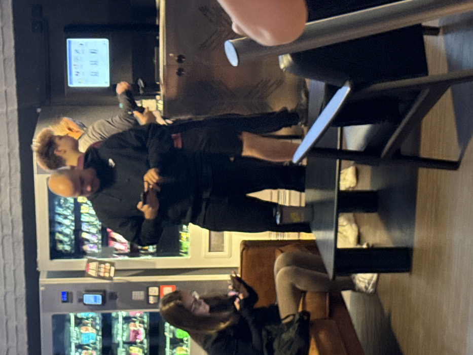 The image depicts an indoor public or commercial space in Berlin, Germany. On the left, a young female with long, dark hair and glasses sits on an orange-brown upholstered armchair, intently using a smartphone. She wears a dark long-sleeved top and light-colored leggings; a dark bag rests on the armchair next to her. In the center, a bald male of medium build stands, wearing a dark hooded sweatshirt with a white logo and dark pants, similarly occupied with a smartphone. A disposable cup rests on a dark rectangular coffee table in front of him. Behind and to the right of the bald male, a younger male with light, curly hair is partially visible, wearing a grey long-sleeved top and dark shorts, appearing to interact with a monitor displaying a graphical user interface on a dark counter. Further right, a partial view of an additional person's leg is visible. The background features two white vending machines stocked with various items, one with a blue digital display. The floor is a wood-look surface. The lighting is artificial and somewhat dim. No direct interactions are observed among the individuals.