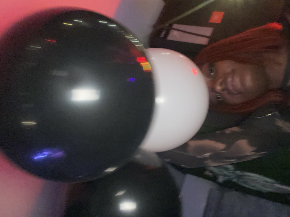 A cluster of black and white balloons partially obscures a woman with reddish-brown hair and pierced lips