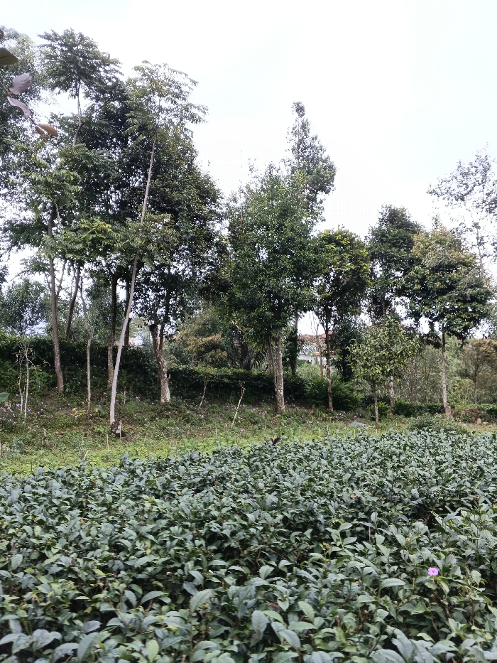 The scene depicts an outdoor agricultural landscape located in the city of Unknown, Vietnam, under an overcast sky. The foreground is dominated by a dense, uniform field of low-lying green shrubs, consistent with a cultivated plantation, with a single small pink flower visible on the right. Immediately behind this field, the midground comprises a slightly elevated grassy slope populated by several slender trees with light-colored trunks and green canopies. A line of denser, dark green foliage forms a hedge-like boundary further back. The background features a cluster of taller, dark green trees. Partially visible through the trees on the right is a building with a reddish-brown tiled roof. No individuals or active subjects are present in the frame.