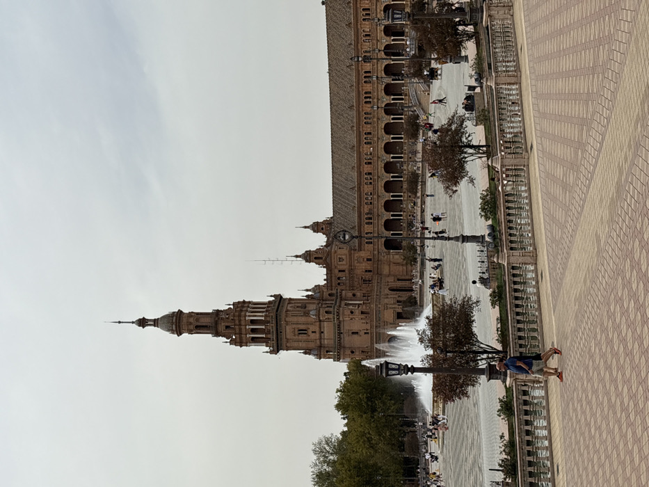 This image depicts a wide view of the Plaza de España in Seville, Spain