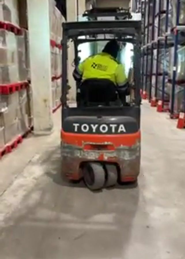 forklift being driven in a warehouse