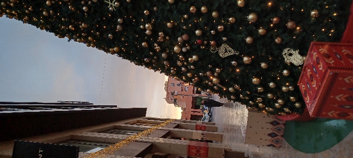 A tall, decorated Christmas tree dominates the frame, adorned with gold ornaments and lights. To the left, a building facade with lit garlands runs parallel to the tree. In the background, a glimpse of a traditional-style building with reddish-brown hues is visible. People can be seen walking in the distance, adding a sense of scale to the scene. Large, decorative gift boxes, patterned with geometric designs, rest near the tree's base. The sky, transitioning through shades of blue and orange, sets a tranquil mood.