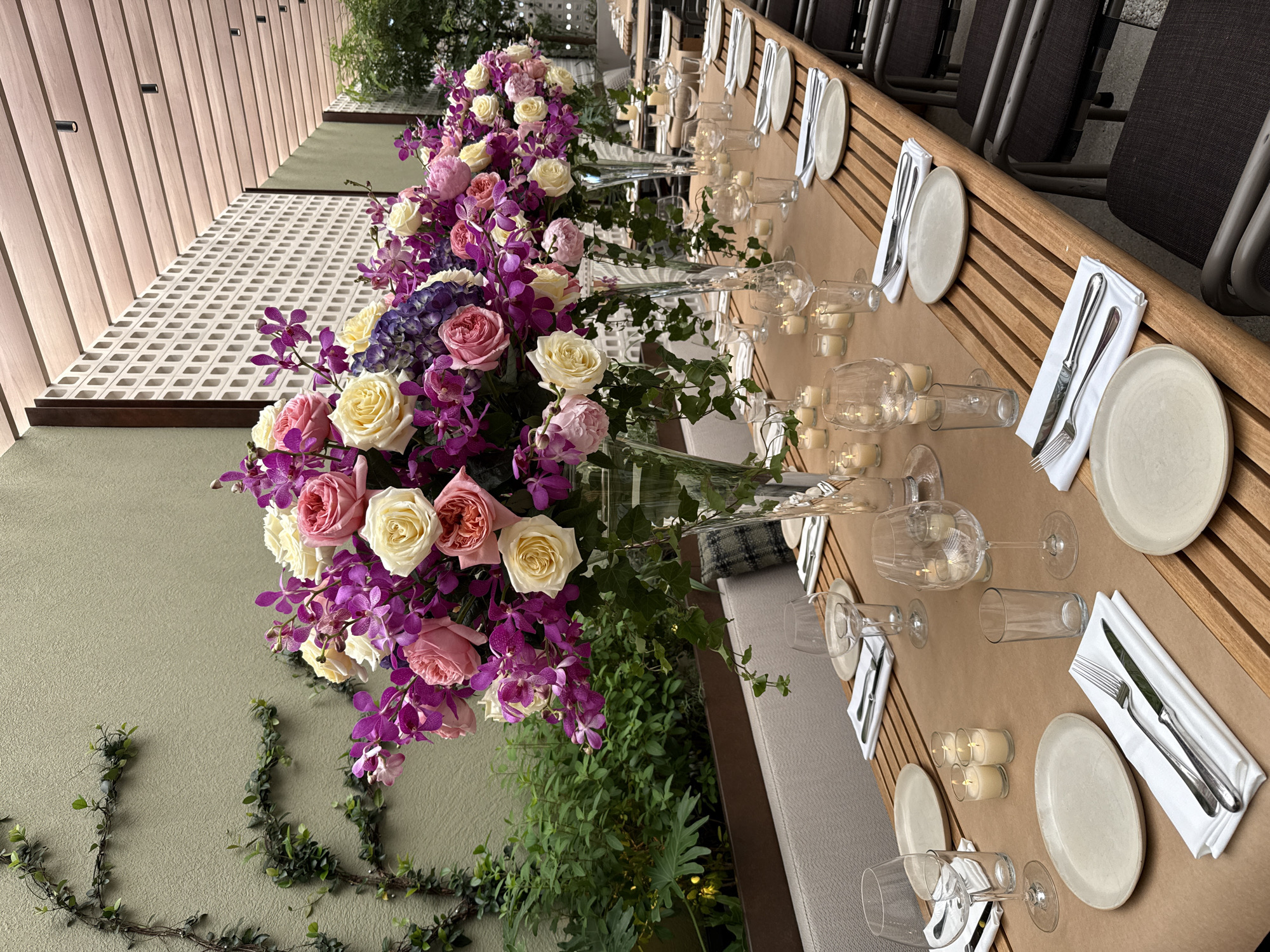 An outdoor or semi-outdoor dining area, likely a restaurant patio or event space, in West Palm Beach, United States of America, is prepared for a formal gathering. The central feature is a long, multi-segment wooden slatted table covered with a light brown paper runner. The table is meticulously set with numerous place settings, each consisting of a light beige plate (both round and oval), a folded white napkin, a fork, a knife, a clear glass wine goblet, and a clear glass tumbler. Small, lit votive candles in clear glass holders are distributed along the table's length. Dominating the table are multiple large, elaborate floral centerpieces presented in tall, clear glass trumpet vases. These arrangements comprise a dense mixture of pink roses, cream/pale yellow roses, bright purple orchids, and blue-purple hydrangeas, with green foliage trailing from the vases. The immediate environment includes a textured light olive-green wall on the left, partially covered by climbing green vines. Further back and to the right, a decorative white concrete block screen wall is visible, beyond which appears another section of the olive-green wall and lush green vegetation in planters. The ceiling overhead is constructed from light wooden slats, featuring several black recessed spotlights. Dark-framed chairs with black cushioned seats are arranged along the tables. No individuals are present in the scene.