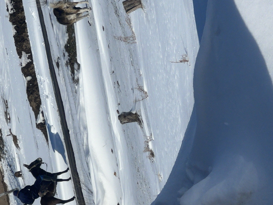 A snowy landscape features a person riding a dark-colored animal in the lower-left. Another animal stands farther away along a path or road. Cut tree stumps protrude from the snow, interspersed with sparse vegetation. A large snowdrift dominates the right side of the image, casting a shadow on the surrounding snow.