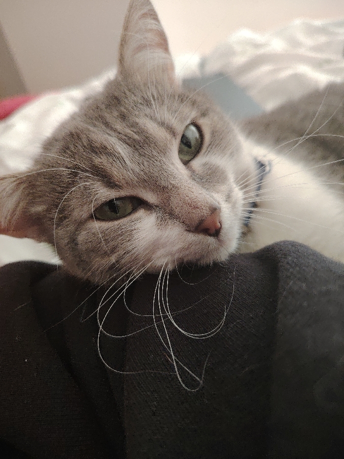 - "An indoor domestic scene depicts a grey tabby cat with white markings, resting its head on a dark, possibly black, fabric surface" by FM-3niFr2, licensed under CC BY 4.0