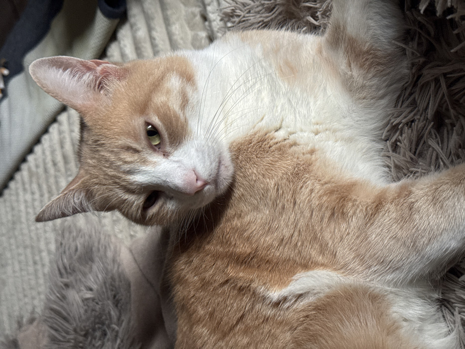 - "The image depicts a domestic cat, an orange and white tabby, lying on a shaggy, light-brown textile surface" by FM-xTDQG2, licensed under CC BY 4.0
