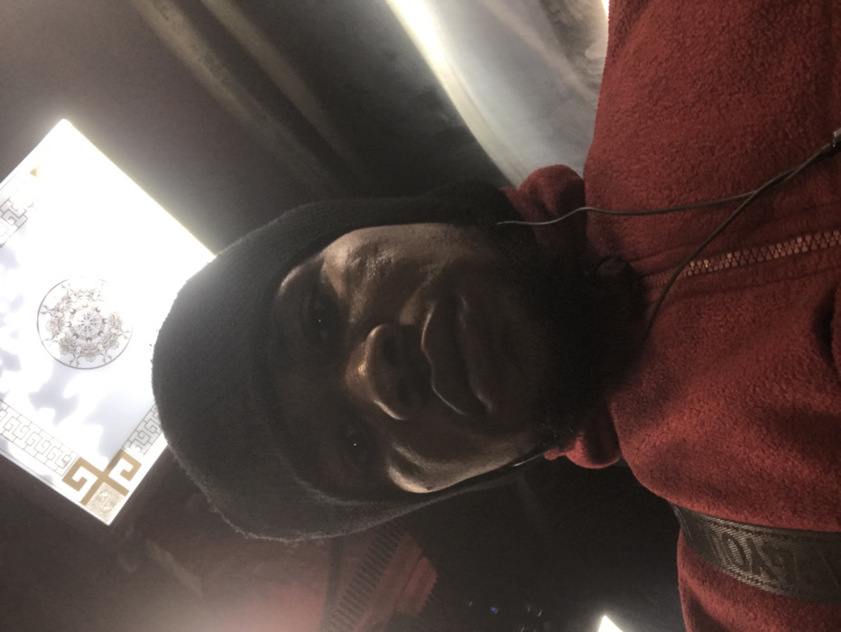 A person with a black beanie and a beard is wearing a red hooded jacket. Earphones are visible near the zipper. A patterned, illuminated ceiling light is overhead. The photo appears to be taken from a low angle, looking upward.
